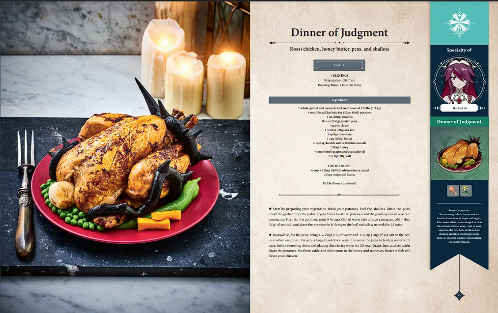 Mengutip dari laporan IGN, buku ini akan menampilkan berbagai hidangan ikonik dari Genshin Impact, mulai dari masakan khas Mondstadt hingga Liyue yang sering muncul dalam Game. Beberapa hidangan yang dipastikan hadir di dalamnya antara lain Jade Parcels, Golden Shrimp Balls, dan Mondstadt Hash Brown.